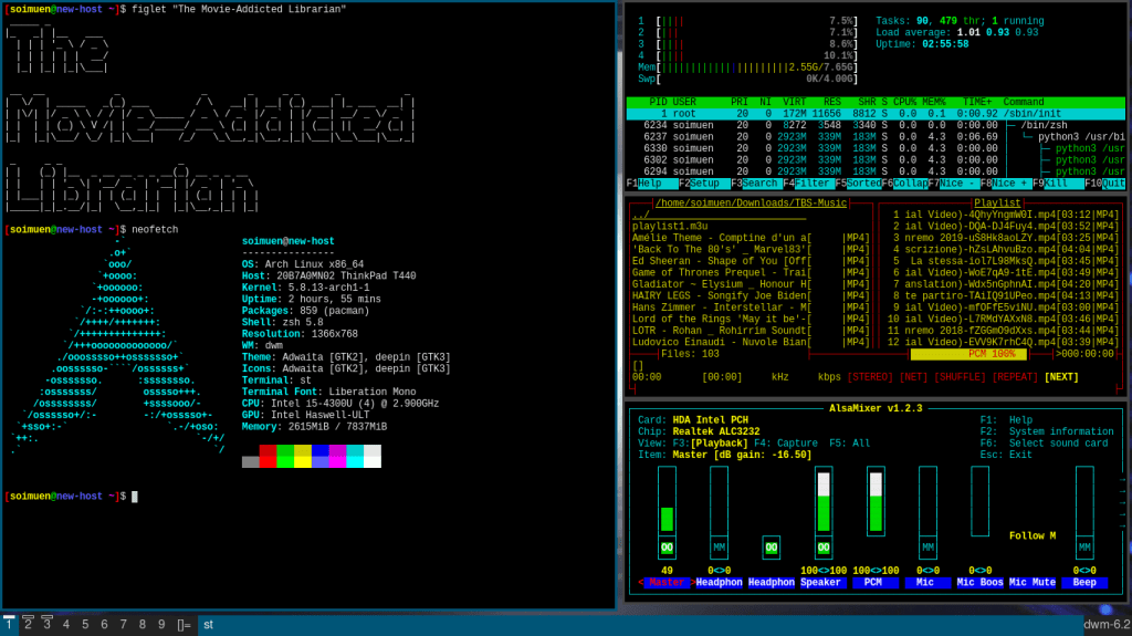 I did tell all about it in my video, but I will sum up the basic ideas here. Essentially, I decided last week to move from Qtile & Termite to Dwm & st. I was extremly satisfied with Qtile and Termite but, from now on, I wish to embrace the suckless philosophy. Some of you may not know what it is, so here is another quick summary. Suckless merely means : software that suck less. It’s as simple as that. I want to get away from bloated software as much as possible and use efficient programs (preferably written in C). Since Qtile is written in Python, I chose to put it aside, at least for some time. I need to get much more comfortable with Dwm & st. Plus, I am quite happy with the result I have obtained with just a few patches. There still is a lot of work to do, but look :