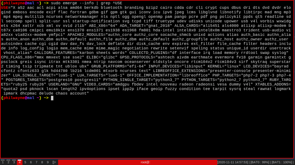 As I am writing this, it is still a topic with which I am not 100% comfortable, since it is quite subtle to get and work with on a daily basis. Use flags are probably the biggest change from an Arch system and what will require the most getting-used-to from you. You can globally activate or deactivate them from your /etc/portage/make.conf file and also locally set them for one single program in /etc/package.use/. Beware, you will need to configure the USE variable differently depending on which profile you have chosen. I speak mostly for KDE and Gnome users, but you should not have to worry since everything is explained really well on this page of the Gentoo documentation.