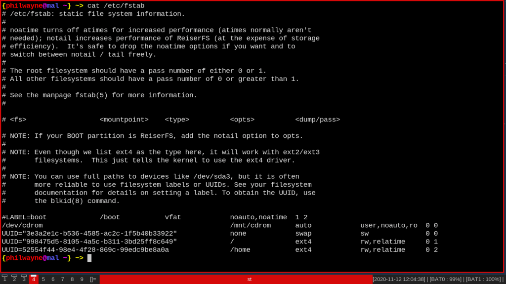 Warning : Do not just copy the examples above! Remember the partition scheme you used and simply put it here. All your mounted partitions should appear in your /etc/fstab. To get the UUIDs (partition labels), you can use the blkid command, like so :